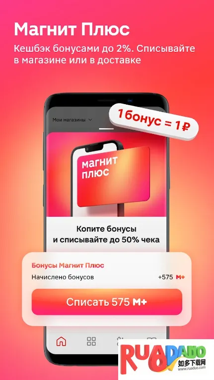 1. Magnit商城为用户提供丰富购物便利与优惠,通过MagnitPlus会员卡可享受购物返现,最高达2%的返现比例,且返现奖励能抵扣消费金额的50%。