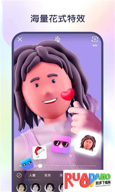 3. 内置丰富创作工具,如美颜滤镜、魔法表情、贴纸、剪辑合并配音等,帮助用户轻松拍出专业感作品。