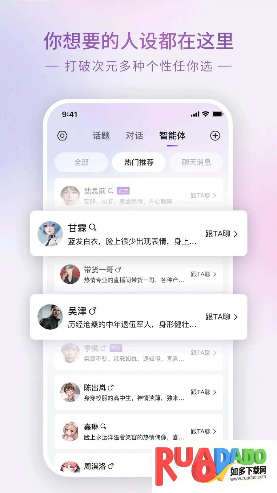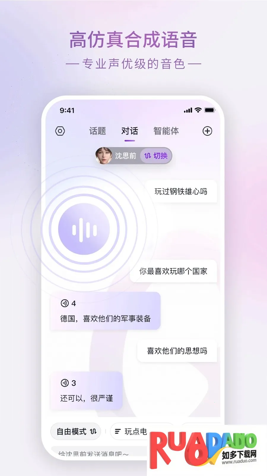 1. 高度自定义智能体,支持设定AI角色的性格、背景、声线,内置多款声优级音色及3D形象,用户可通过对话持续优化角色行为逻辑。