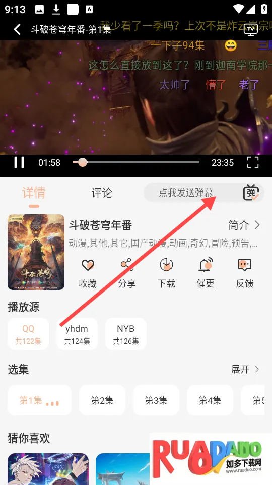 3、接着点击下方箭头所指的图标,还可以实时发送弹幕哦。