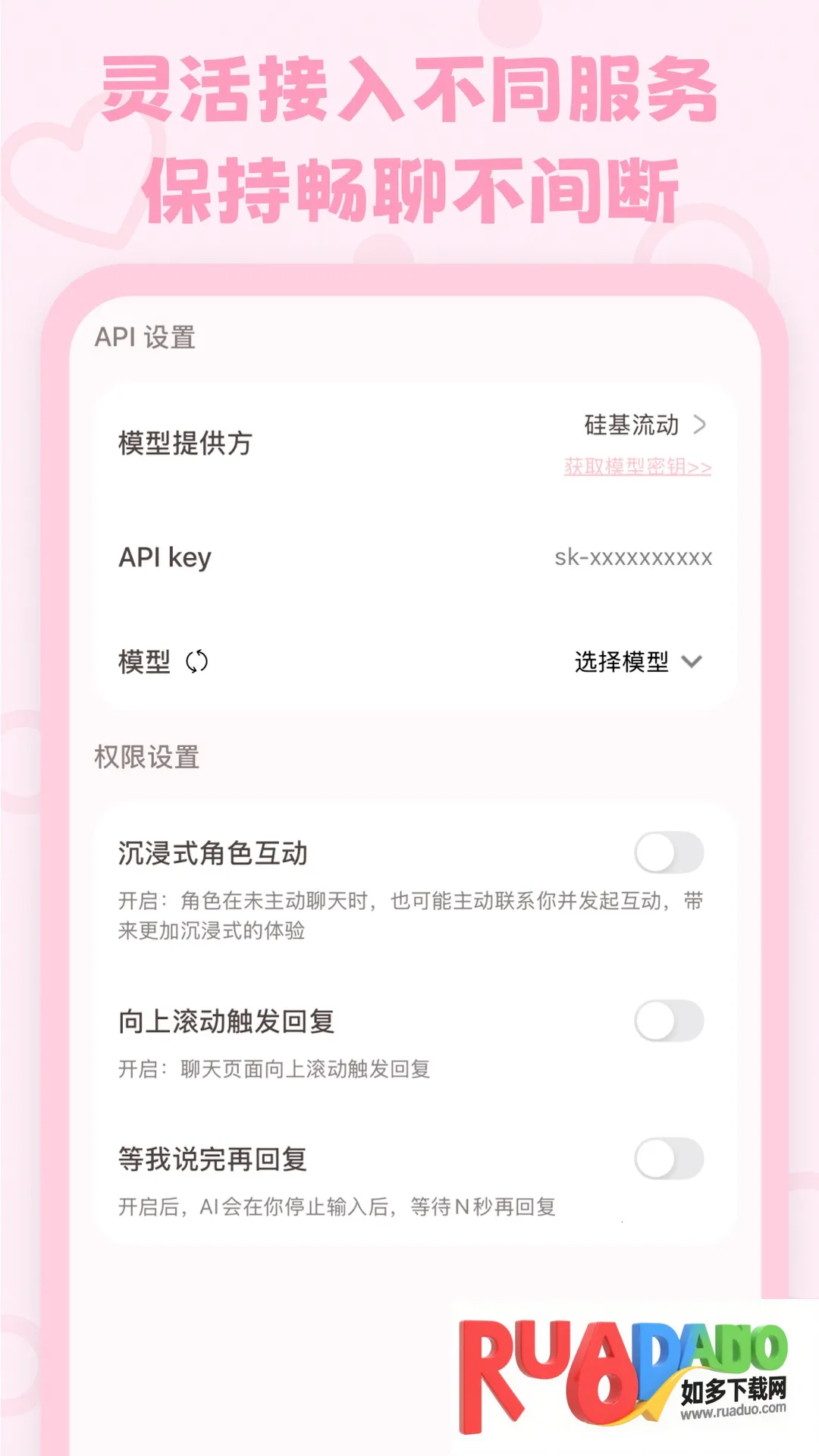 软件使用直观,无需技术背景,进阶用户可接入自有API。回复自然流畅,支持多轮互动和情绪共鸣。本地开关可随时清空聊天记录,保障隐私安全。有签到系统,分享互动还能增强情感连接。快来下载Lovemo,开启个性化且沉浸式的陪伴体验吧!