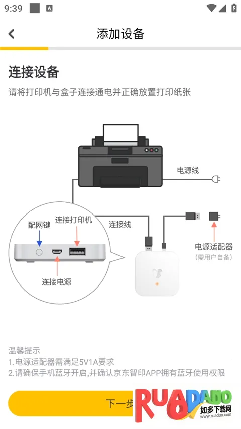 注意:确保打印机已连接电源并开启,将京东智印盒子与打印机按照说明书的指导连接起来。