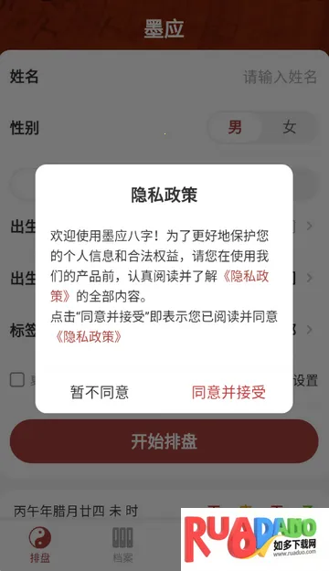 1、打开墨应八字app,点击同意隐私政策