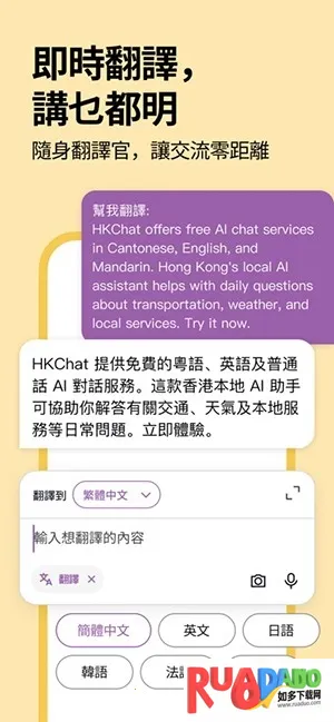 港话通HKChat是香港首个AI智能聊天软件,融合本地知识库与政府数据,信息可靠实用。支持三语自由对话,内容涵盖出行、天气等多类。亮点是两文三语无缝切换、本地知识库深度融合,还可注册登录,具备多种优势。
