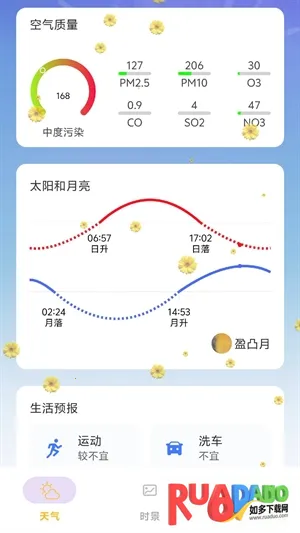 3. 生活指数提示,涵盖穿衣、洗车、运动等实用生活指数,根据天气给出合理建议。