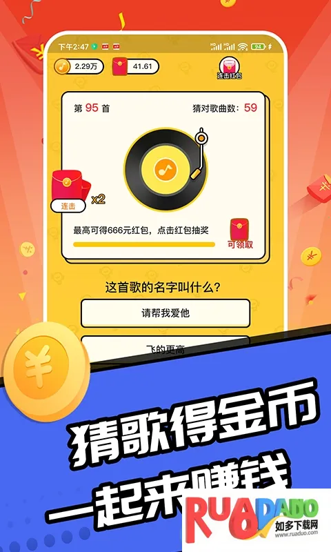 趣猜歌达人红包版是一款超有趣的猜歌软件。它有海量精心挑选的经典歌曲,涵盖网络歌曲、热门歌曲、经典老歌、KTV热曲等多种类型,共计5000首,让你尽享音乐盛宴。操作简单易上手,只需听着歌曲猜出歌名就行。答题玩法轻松有趣,带来潮流音乐体验。还能与全球猜歌爱好者数据连通比积分,看看谁才是真正的歌王。猜对歌曲通关就能获得现金奖励,积累到一定数量可提现。有挑战赛和闯关两种模式,挑战赛能选擅长主题挑战拿奖励,闯关模式限定时间内猜对歌名也有奖励。软件会不断更新曲目,每周增加新的,让你不会感到无聊。快来下载趣猜歌达人红包版,展现你的聪慧,享受猜歌乐趣,还能赚点零花钱!