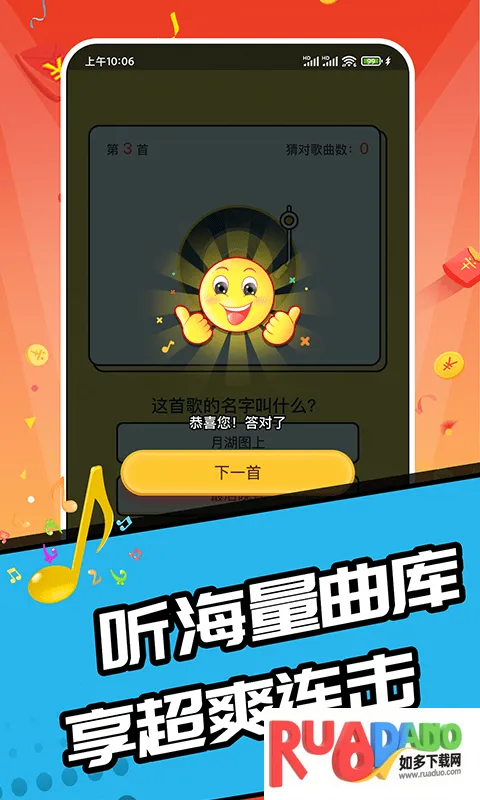 2. 操作简单易上手,只需听歌判断歌名就能轻松闯关。