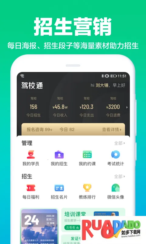 1、下载进入驾校通,在首页中可以看到有招生名片、教练会员、招生段子等功能,更有更有效的进行招生;