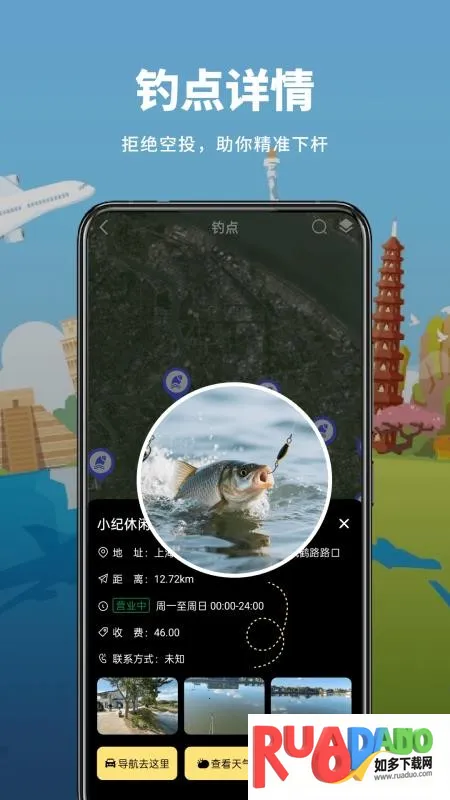 4、可跟随定位了解自身海拔精准度,点击不同地点查询钓点、了解渔获,知晓景点信息。