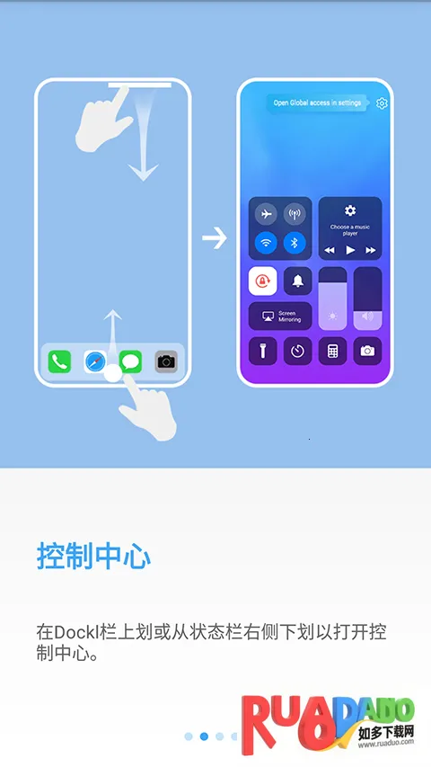 在dockl栏上划或从状态栏右侧下划以打开控制中心。