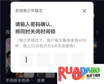 3、再次点击青少年模式后输入密码即可关闭。