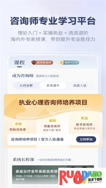 1、汇聚权威专家资源,提供丰富专业课程与直播服务,助力咨询师系统提升专业胜任力与实操技巧。