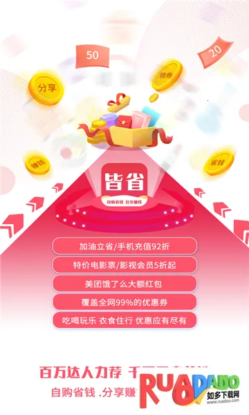皆省2026最新版本是一款网购省钱工具软件,有海量商品资源,设团购省钱攻略。界面简洁,操作流畅,定期更新商品信息与优惠券。还有新人专享、百万补贴、全部包邮等特色,让购物更实惠便捷。