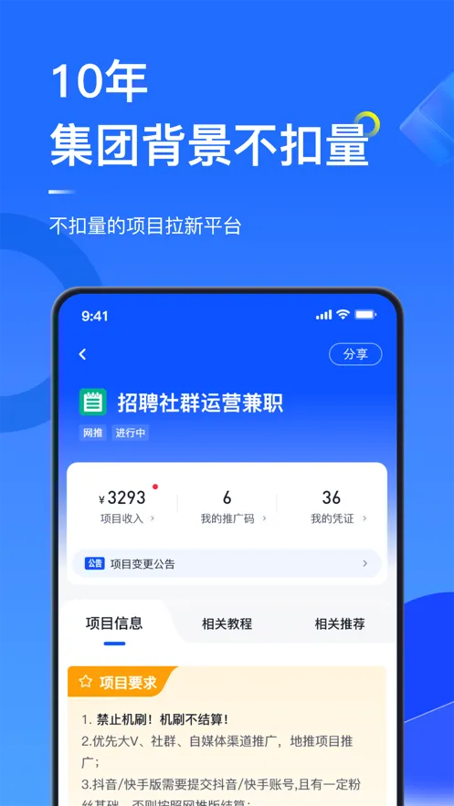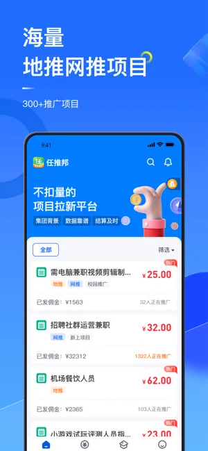 任推邦安卓版是接单推广拉新平台,有海量地推网推项目超500个。10年集团背景,数据靠谱、结算及时。提供多种推广方式与培训教程,能在线管理任务、记录资金,助用户轻松开展副业 。