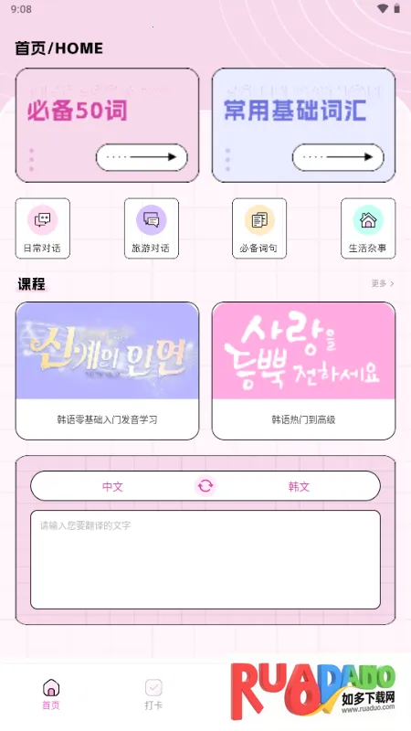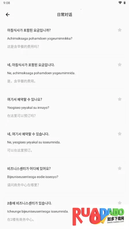 2. 内置实用韩语交流内容,含常用语句与发音教学。