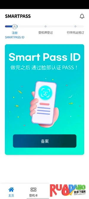 3.点击界面中的“备案”选项,开始注册个人的SMARTPASS账号,随后按照系统提示依次完成护照扫描.护照芯片读取以及人脸验证流程。