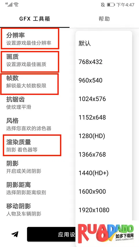 2、往下滑动屏幕,包括分辨率、画质、帧数、抗锯齿、风格、渲染质量、阴影、阴影距离、移动阴影、纹理质量、效果质量、改善效果等等选项可以选择修改,