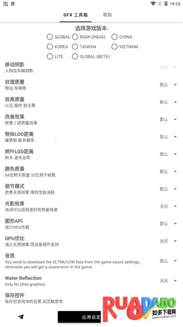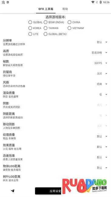 暗区突围gfx工具箱2026下载怎么样?它有着诸多优势。兼容大量机型,能让众多用户直接使用,设置过程更轻松便捷。软件界面简洁干净,没有广告干扰,可专心使用。而且一切都能按照自身需求来调整,毫无限制。下载它,能在暗区突围等游戏中,按照自己心意定制游戏画面,享受独特的游戏体验,轻松感受不一样的游戏乐趣。