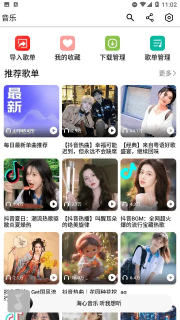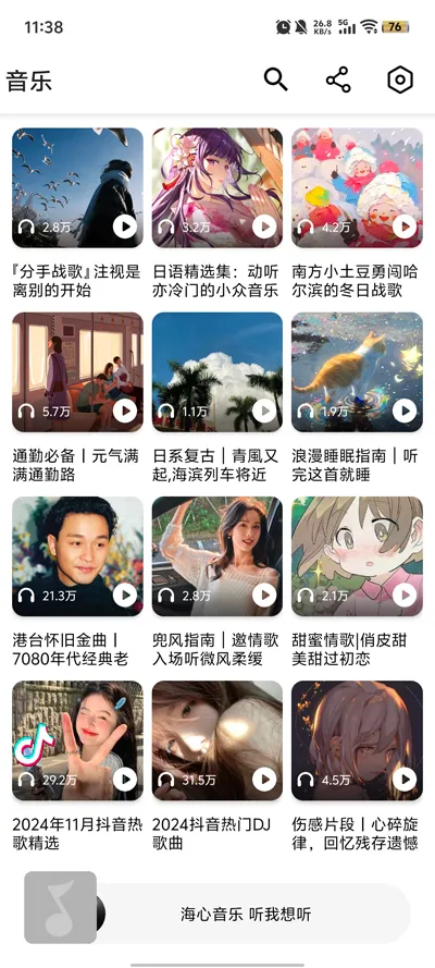 海心音乐是免费音乐平台,专为爱好者打造。界面简约,操作便捷。曲库海量多元,涵盖各风格。支持精准搜索、特色推荐,提供高品质音质。还能创建歌单、离线下载,满足多样音乐需求 。
