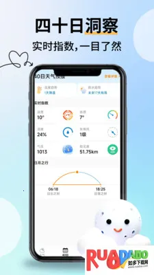 3、四十日洞察,长期趋势一目了然。可查看长达40日的温度与降水趋势,展示体感温度、湿度等实时指数,还有日出日落时间,提前做好中长期安排。