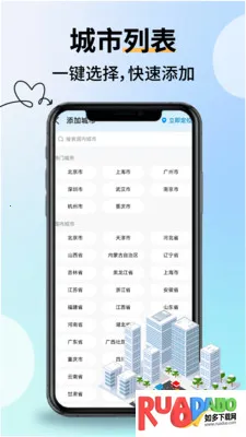 4. 多城管理便捷切换,支持一键添加热门城市与国内各省市,快速定位当前位置,轻松管理多城市天气信息。