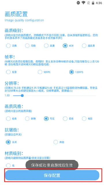 能自动检测手机配置,为玩家提供适配的画质方案,一键应用可提升游戏基础画质、帧率、分辨率等设置。