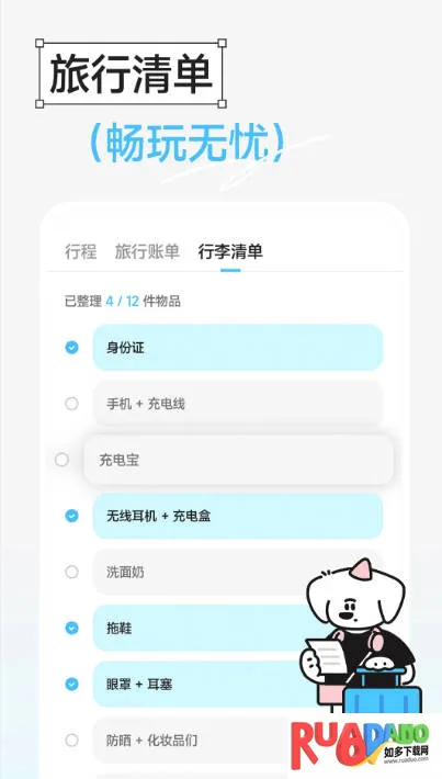 3. 行李清单贴心:内置大量行李物品,支持自定义,和丢三落四说再见,畅玩无忧。