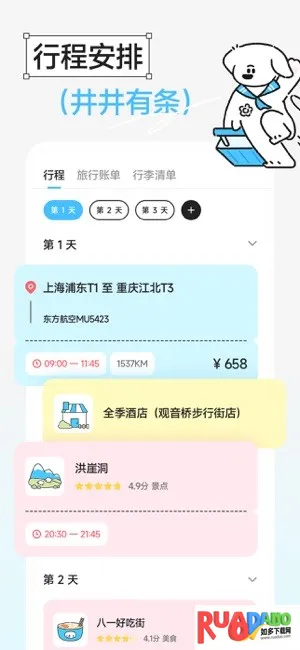 1. 行程规划简便:以天为单位组织行程,支持航班火车车次导入,还能导入小红书攻略,自动识别地点,旅游小白也能轻松搞定。