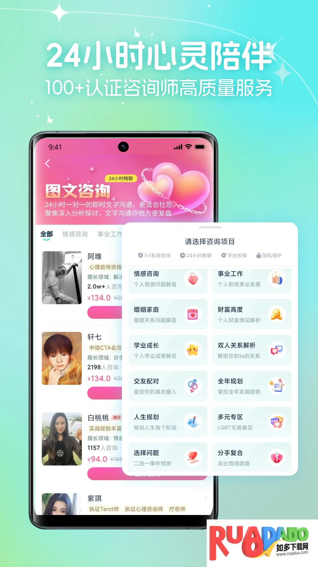 4. 拥有多领域专业咨询师,24小时全面测试解析多种问题,给予幸福指引 。