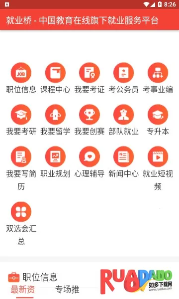 1、提供一站式求职服务,涵盖找工作、考研、专升本、考证等众多模块。