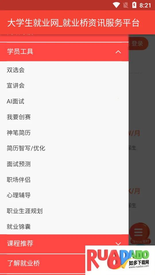 1、提供一站式全流程求职服务,涵盖找工作、考研、专升本等众多模块。
