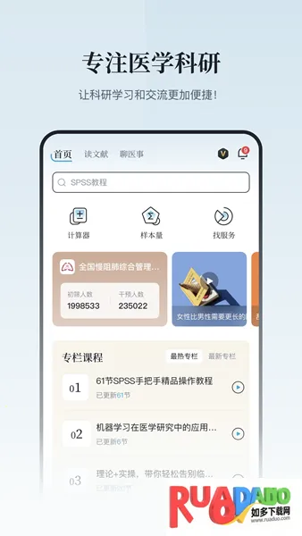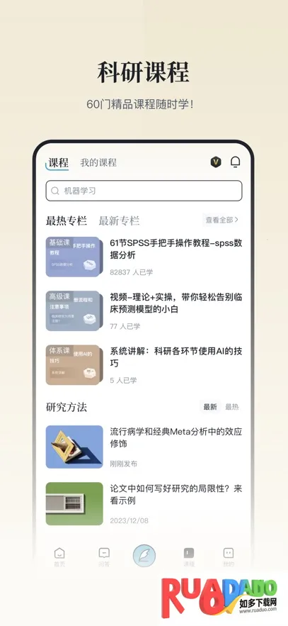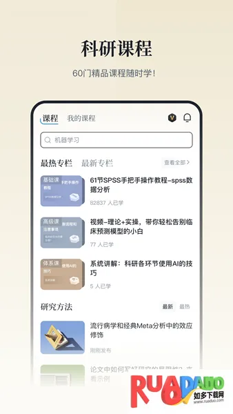 2. 学习资源丰富:提供60门精品科研课程,涵盖多种统计分析教程等高质量内容;有文献解读栏目,专家领读高分文献。