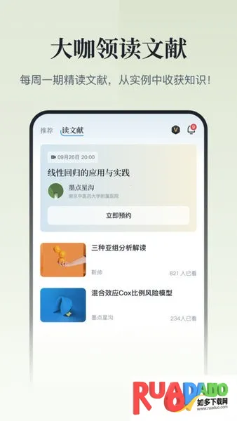 3、大咖领读文献,每周一期精读,助用户从实例中收获知识。