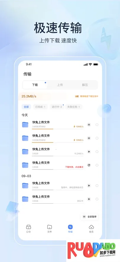 1、速度表现出色,服务器节点广,智能路由确保上传下载高速稳定,大文件传输也流畅。