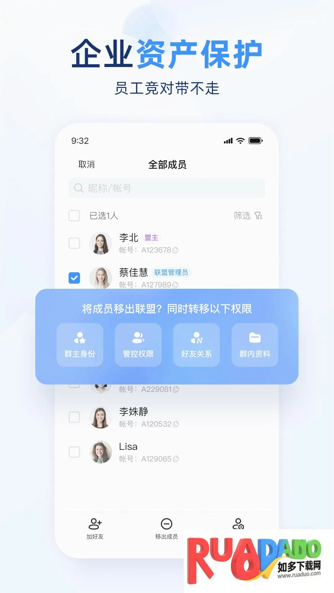3、群成员的文件、图片、留言等内容受管理员权限管理,保障企业材料与成员信息安全。