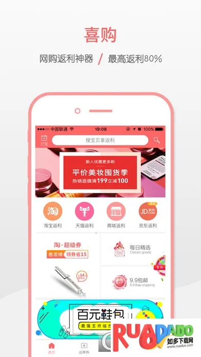 2、商品优质:每日有网购达人选全网优质且返利商品,助用户省却搜索筛选麻烦。
