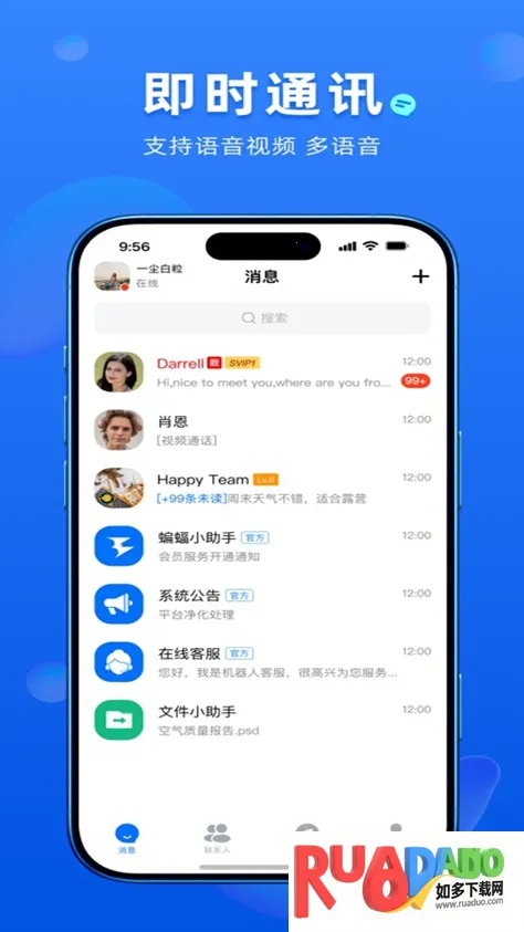 2. 功能多样:支持文字、语音、视频通话及文件传输,有500人超大群组,还有功能频道订阅等。