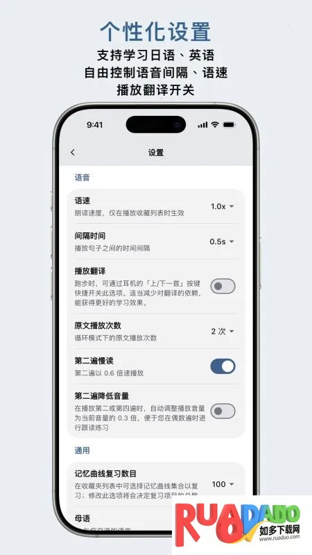 2. 个性化设置:可依据自身外语口语能力,对语音间隔、语速、播放翻译等进行设置,带来更好学习体验。