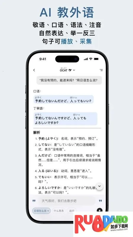 OCAT 是一款外语口语学习软件,支持英、日、汉、法等多语言学习。具备语音设置、收藏夹管理等功能,有互动学习、场景对话等特色,还提供个性化学习模式,能满足不同用户外语学习需求 。