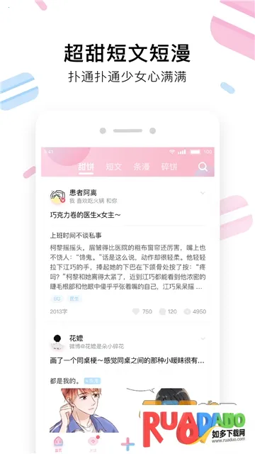 2. 创作自由:用户能自由创作脑洞甜文甜漫,社区专注甜蜜故事,无伤感悲剧元素,作者作品无需催更。