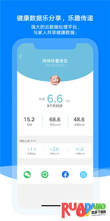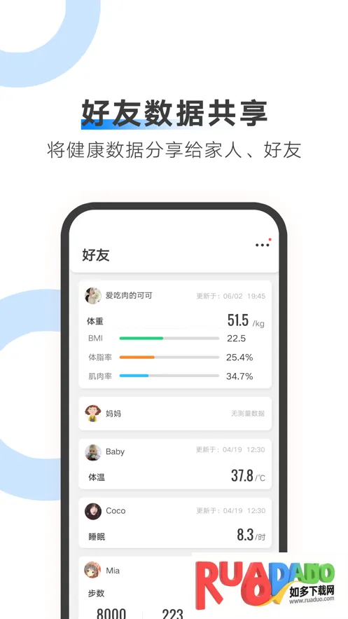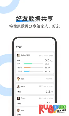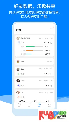 4、数据无忧,测量数据云存储,跟随用户不丢失,还能通过好友功能实现数据互通,全家共享智能生活。