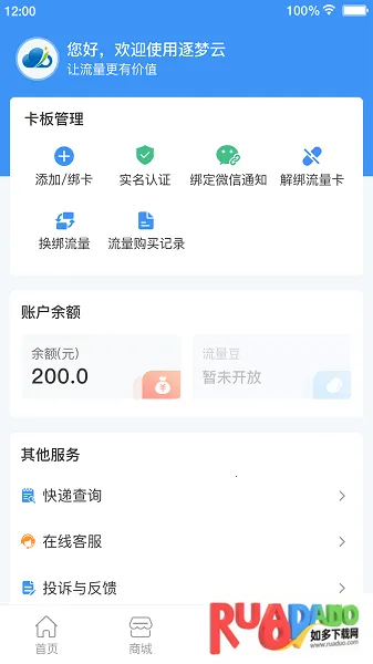 4、可完成各类智能物联网设备及生态产品的基础控制与管理,还能实时管理流量情况,提供断网警告,可随时订购流量。用户有疑问还能随时咨询在线客服。