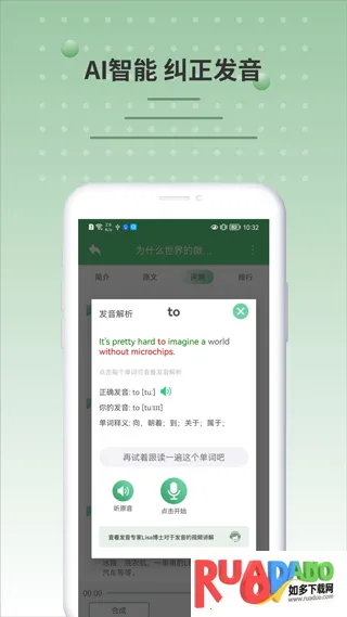 2、具备口语评测功能,通过智能语音技术自动评价发音水平,定位发音错误与缺陷,助力发音提升。