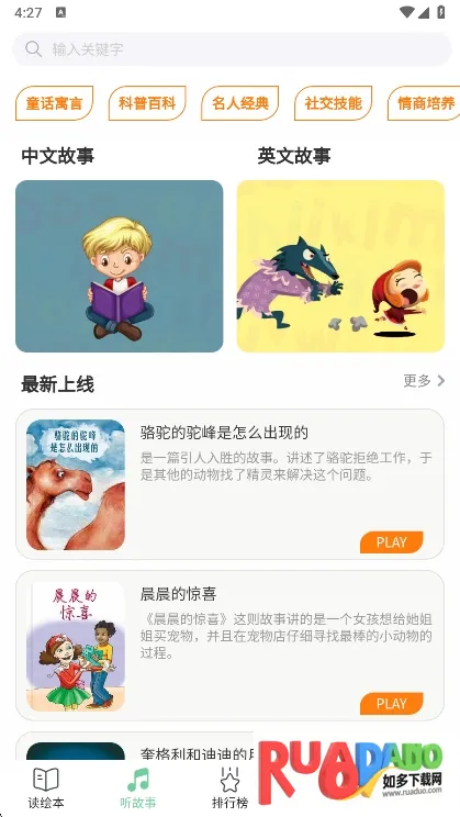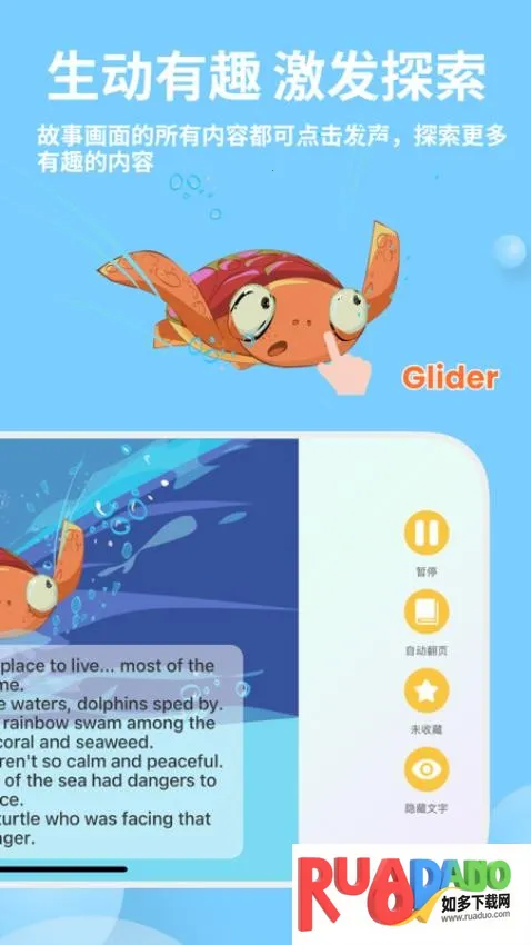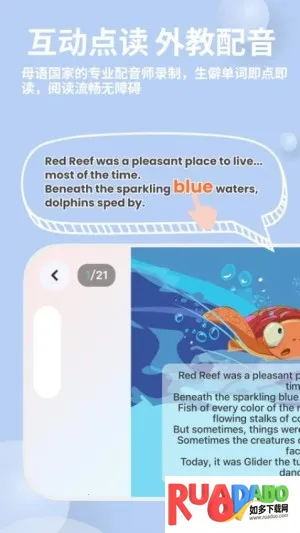 1、专为儿童早教研发,汇聚海量精美插画绘本与有声故事资源,提供标准单词句子发音学习,助力孩子享受阅读乐趣,打下坚实英语基础。
