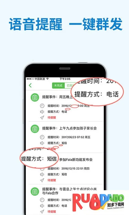2、提醒多样:有语音电话和文字短信两种提醒方式,还有定时回拨功能,重要任务会议可通过电话语音或短信提醒备忘,还能一键群发多人。