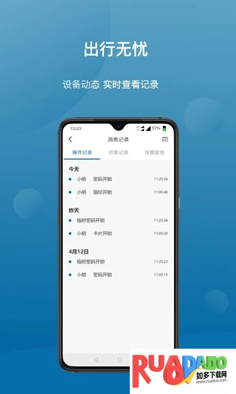 3、可使用 app 查询开门记录、门锁电量,远程授权他人查看设备及进行基本设置,结合数字技术与智能硬件,使门锁使用更简单便捷。