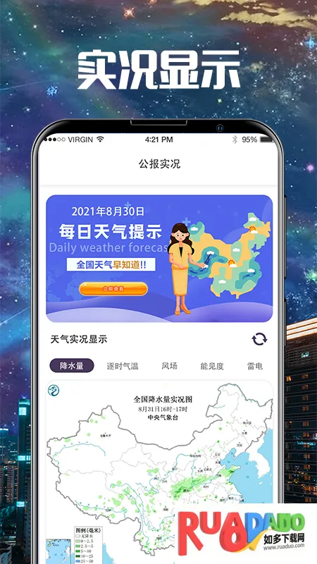 1、实时精准预报:能实现精确到半小时的实时天气预报,24小时无缝追踪天气变化,让您随时掌握天气动态。