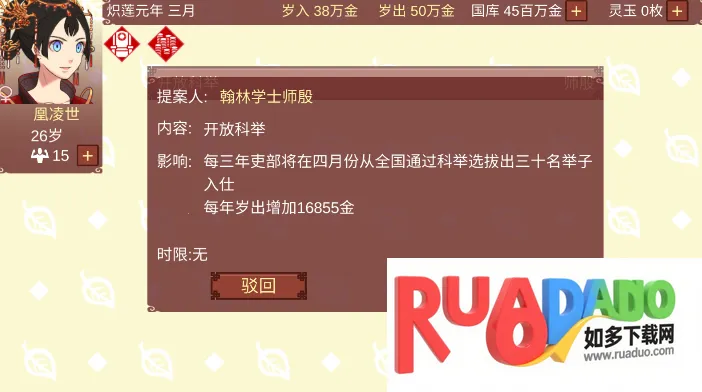 2、多样宫廷玩法:每一局可通过任免、赏赐、斥责等操作调整朝堂及后宫布局与参数,还结合了政务管理和后宫互动,提供丰富策略玩法。