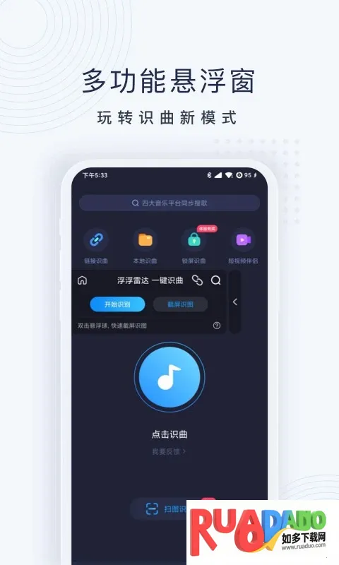 浮浮雷达2025是酷狗倾力打造的听歌识曲软件。它曲库全,0.1s无延迟精准识别,歌词、前奏、哼唱都能识别。包体小巧,支持悬浮识曲,能关联酷狗音乐,还有视频链接识曲等特色功能。