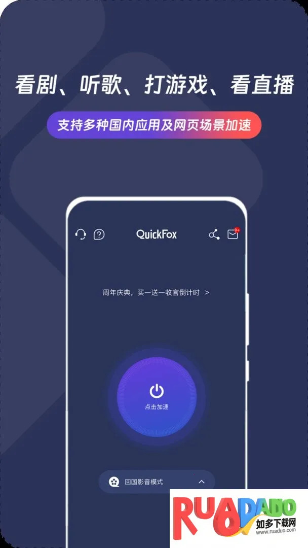 1、QuickFox专为海外华人用户定制,能有效解决海外用户访问国内应用时的高延迟问题,一键加速回国,畅享国内应用,覆盖全球网络节点,为用户提供稳定快速的网络连接。